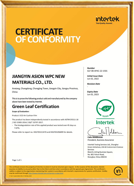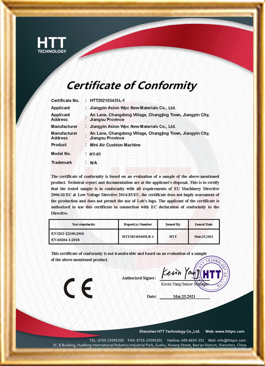 Jiangyin Asion Wpc New Materials Co., Ltd. was established in 2004 with a registered capital of 10 million cny. It is a professional manufacturer specializing in the research, development and production of air cushions, paper cushion materials, equipment and related expansion systems. Mainly produces inflatable air cushions, paper cushion materials and machines for various industries, such as air bubble cushion machine;paper air pillow cushion film;air bubble cushion film;paper cushion system;gummed tape system;air column system;vacuum bags and so on.