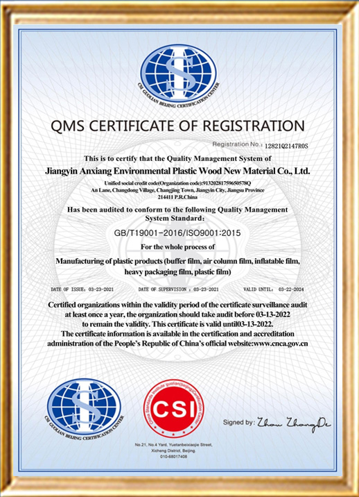The company covers an area of 10,000 square meters, and has 2 self-owned 400KV transformers. There are 12 high-speed film blowing machines, 30 high-speed bag making machines (including 10 latest high-speed bag making machines), more than 50 professional and technical personnel, the monthly production capacity of buffer original film is 1,000 tons, the monthly production capacity of gourd film can reach 100,000 rolls, and the bubble pillow The monthly production capacity can reach 60,000 rolls, the monthly production capacity of air column rolls can reach 30,000 rolls, and the monthly production capacity of inflators can reach 3,000 units. The company's standing inventory includes 30,000 rolls of gourd film, 20,000 rolls of bubble pillows, and 2,000 inflators. The company has multiple buffer film performance testing instruments to ensure that the finished product qualification rate reaches 99.9%.